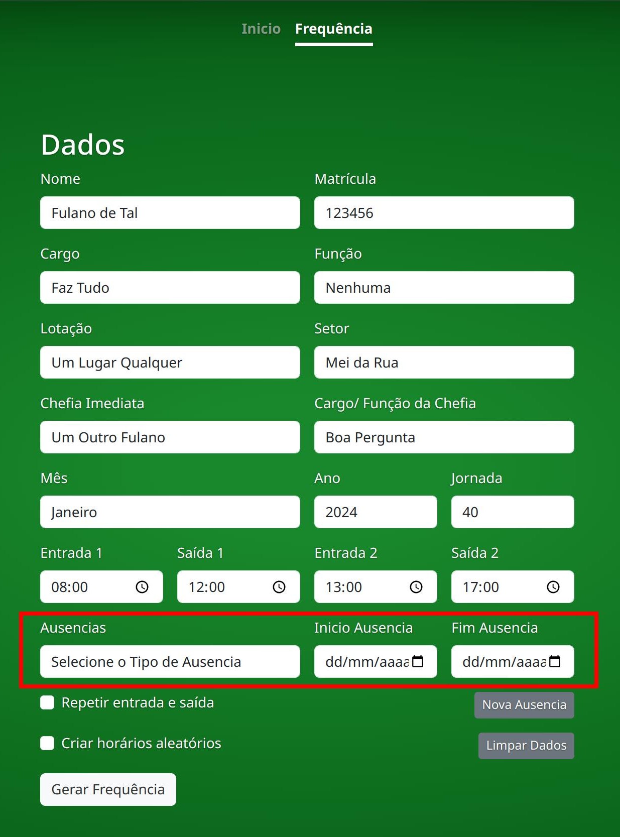 4. Caso exista mais de um tipo de ausencia, clique no botão "Nova Ausencia" para criar novos campos a serem preenchidos.