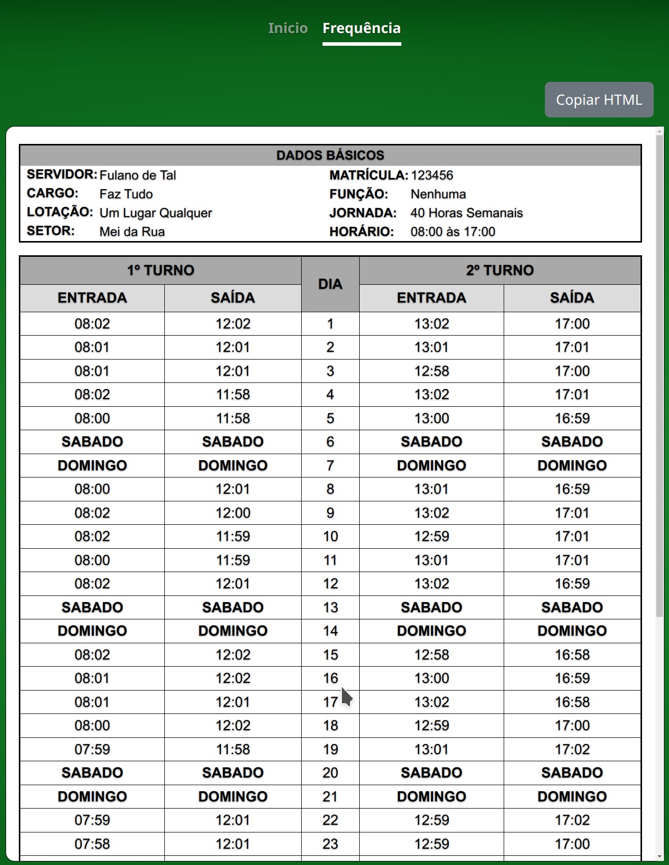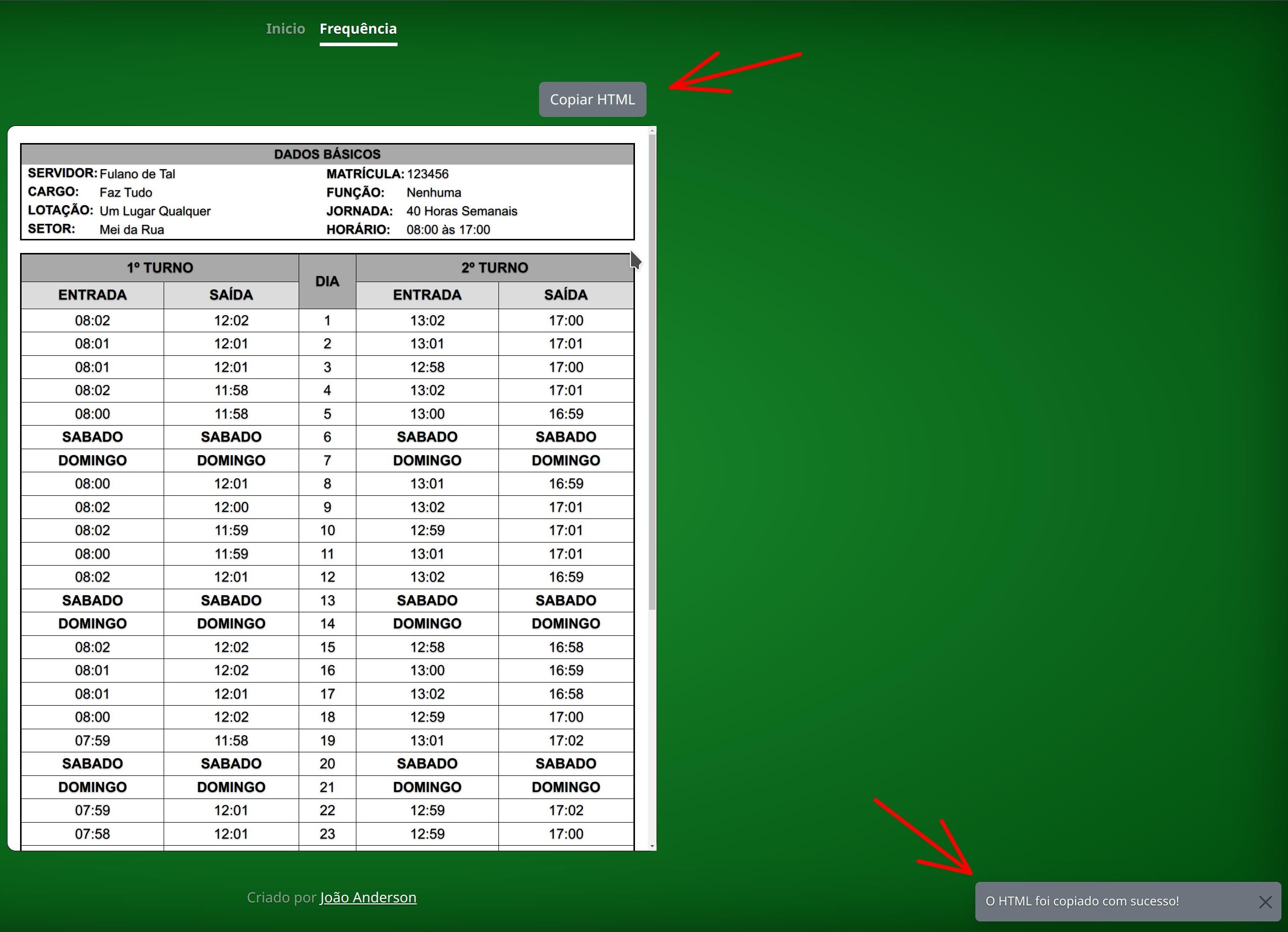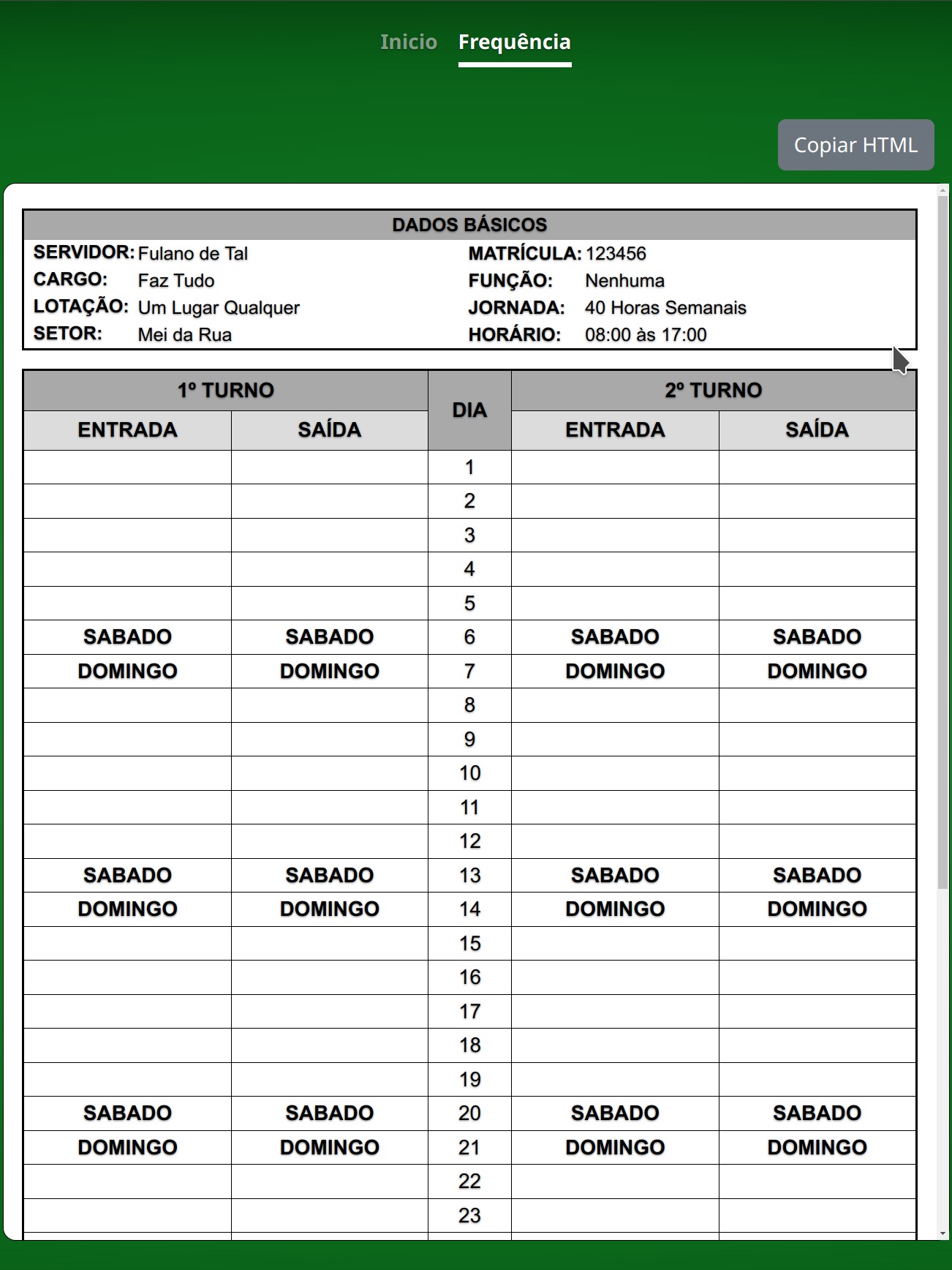 9. Após a geração da frequência clique no botão "Copiar HTML" para copiar o código HTML da frequência para a área de transferência.